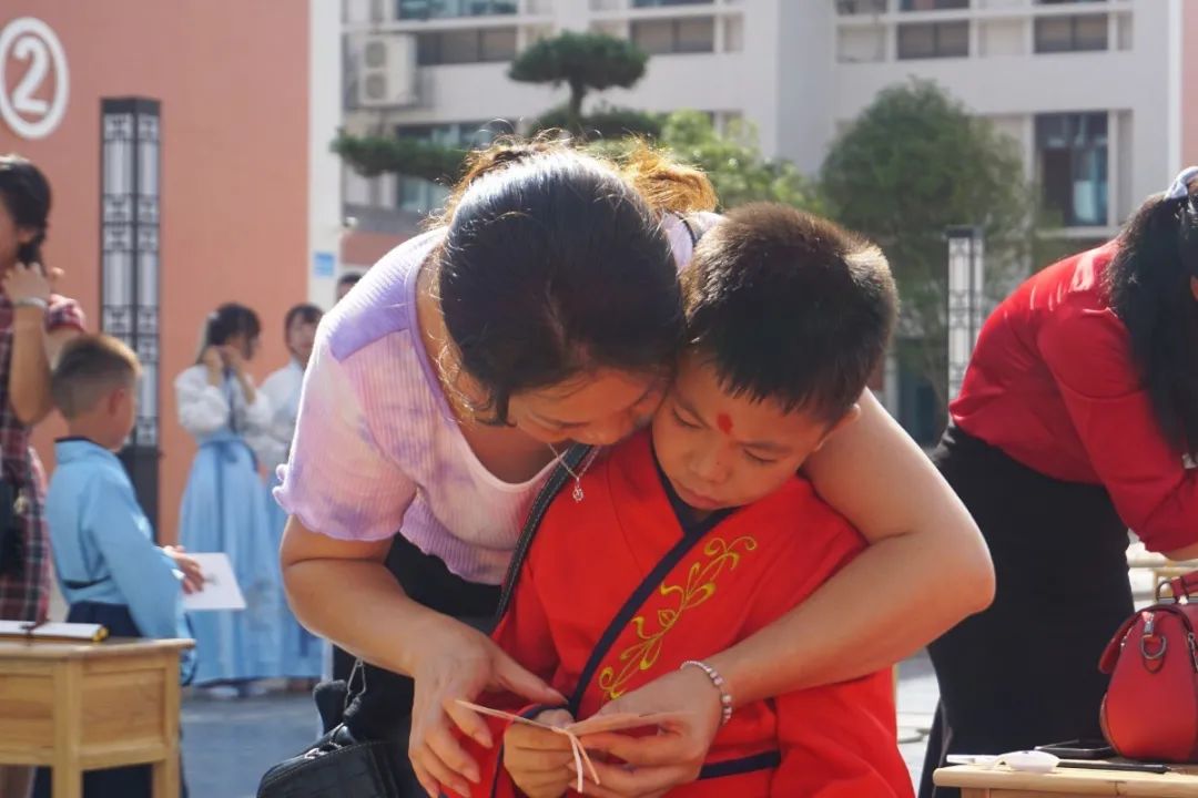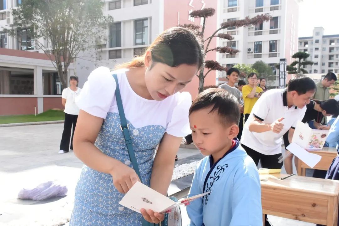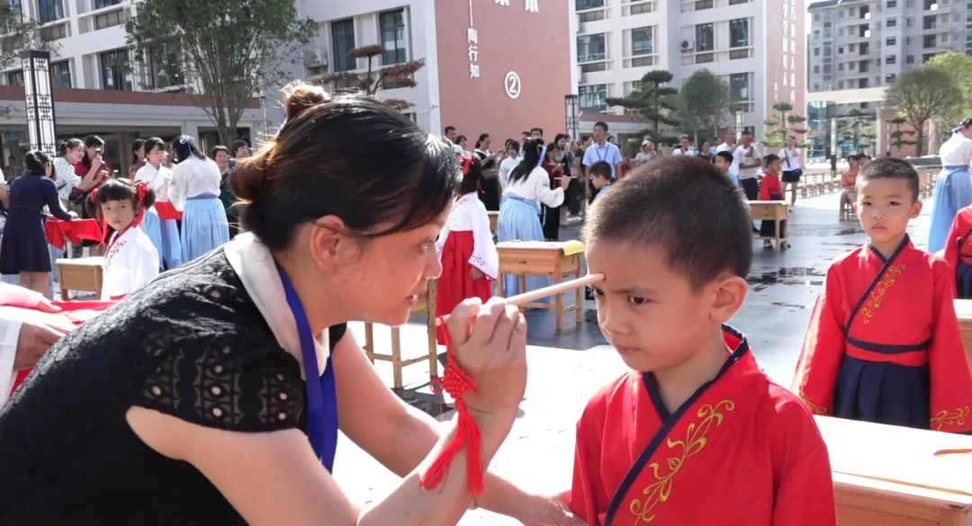 學(xué)校領(lǐng)導(dǎo)和老師們俯下身子,笑意盈盈地逐個為孩子們點朱砂,一張張稚氣的臉上多了一分靈氣和自信。