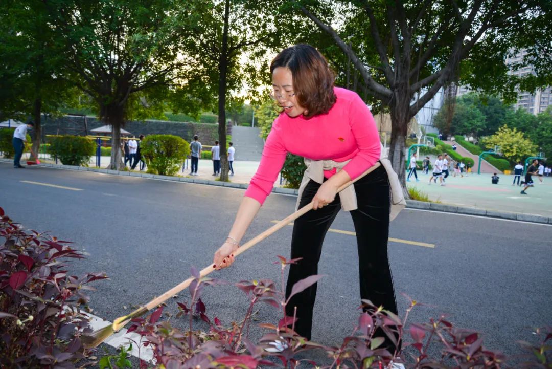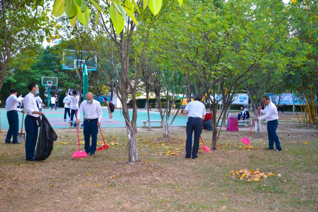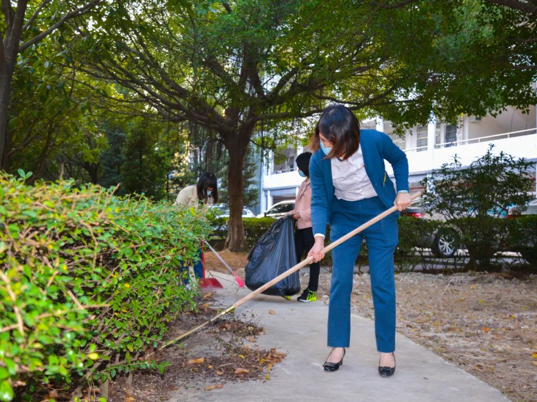 黨員們佩戴黨徽,情緒高漲,熱情飽滿,清理中堅樓小樹林及厚德大道等區域綠化帶中的落葉,不放過任何死角,大家勞動的身影猶如一道亮麗的風景。