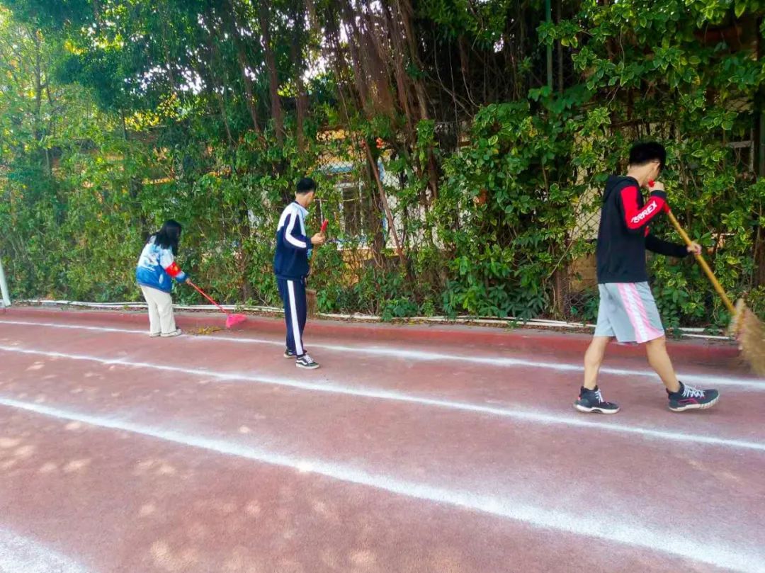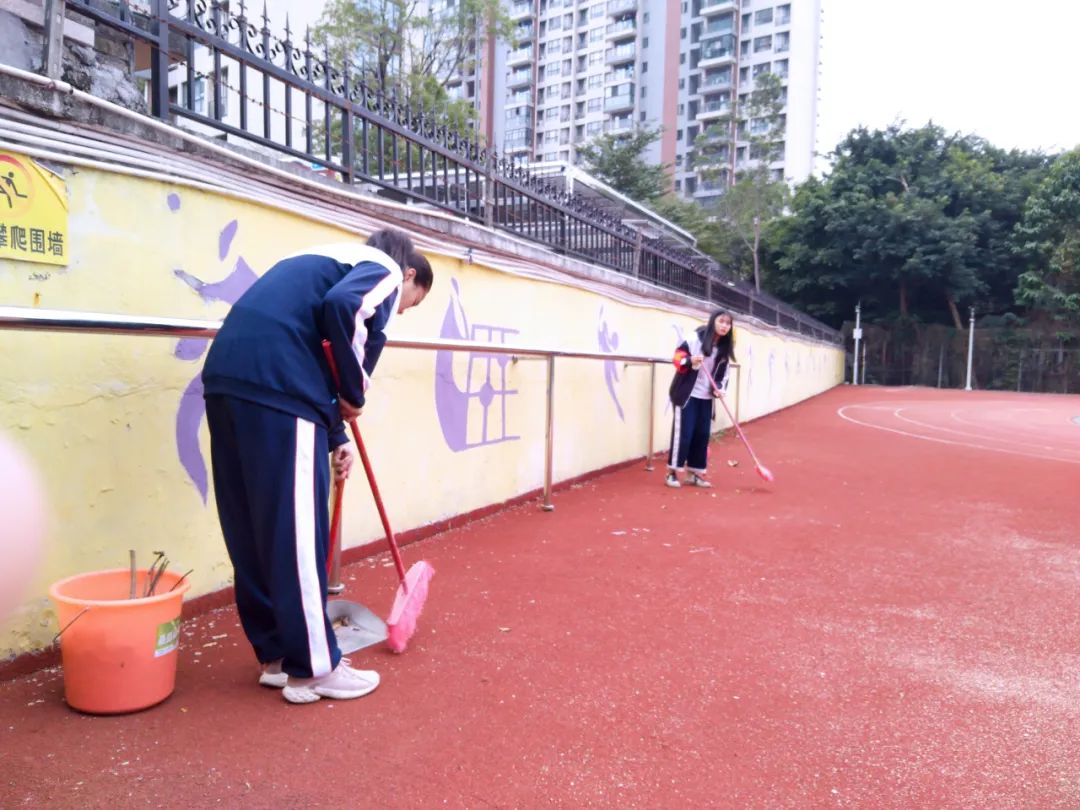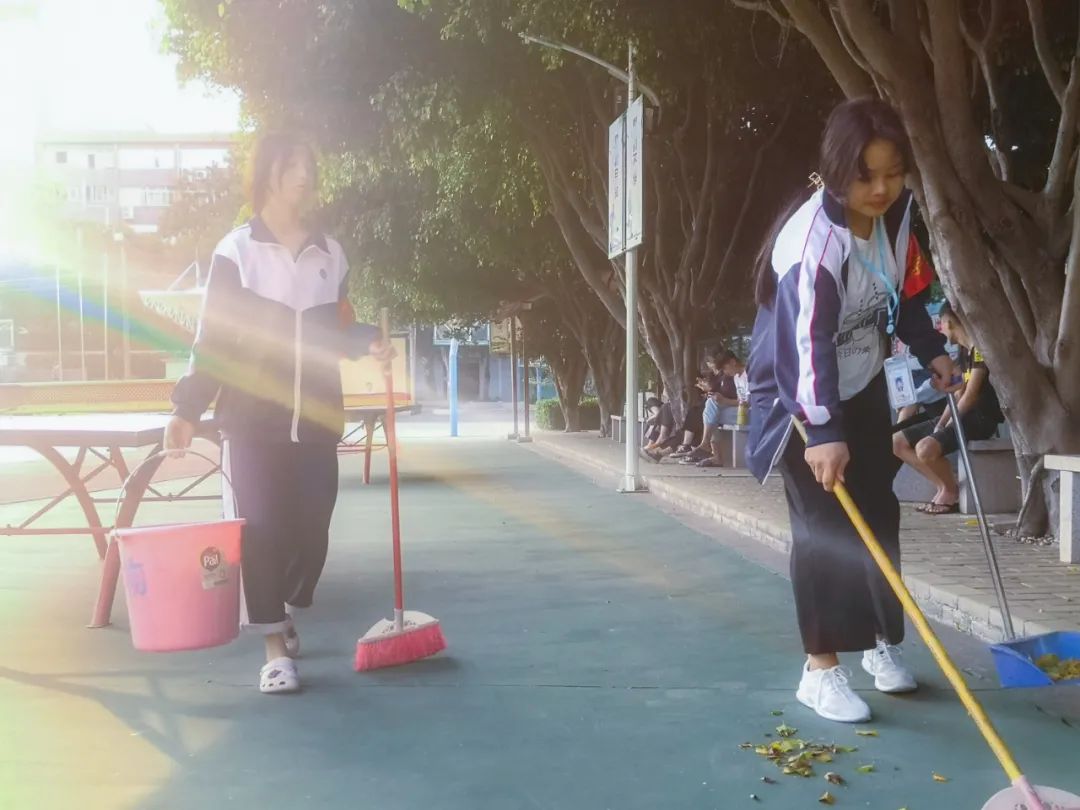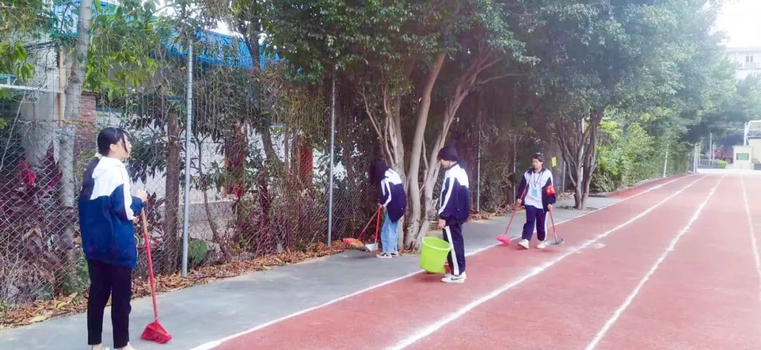 提前到達(dá)操場(chǎng)的是王廷榮、黃詩(shī)文、李仁懷、李燦彬、溫善媛等同學(xué)。他們揮動(dòng)著掃把便開(kāi)始“沙沙”地清掃落葉,掃地的聲音好像鳥(niǎo)兒在對(duì)他們唱歌,又像是在鼓勵(lì)他們:“勞動(dòng)的孩子最美麗”。
