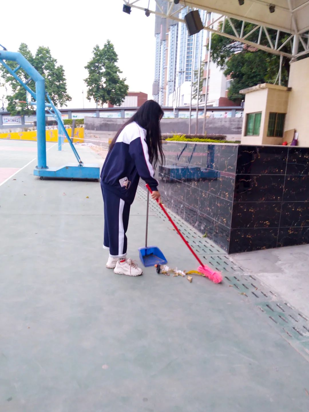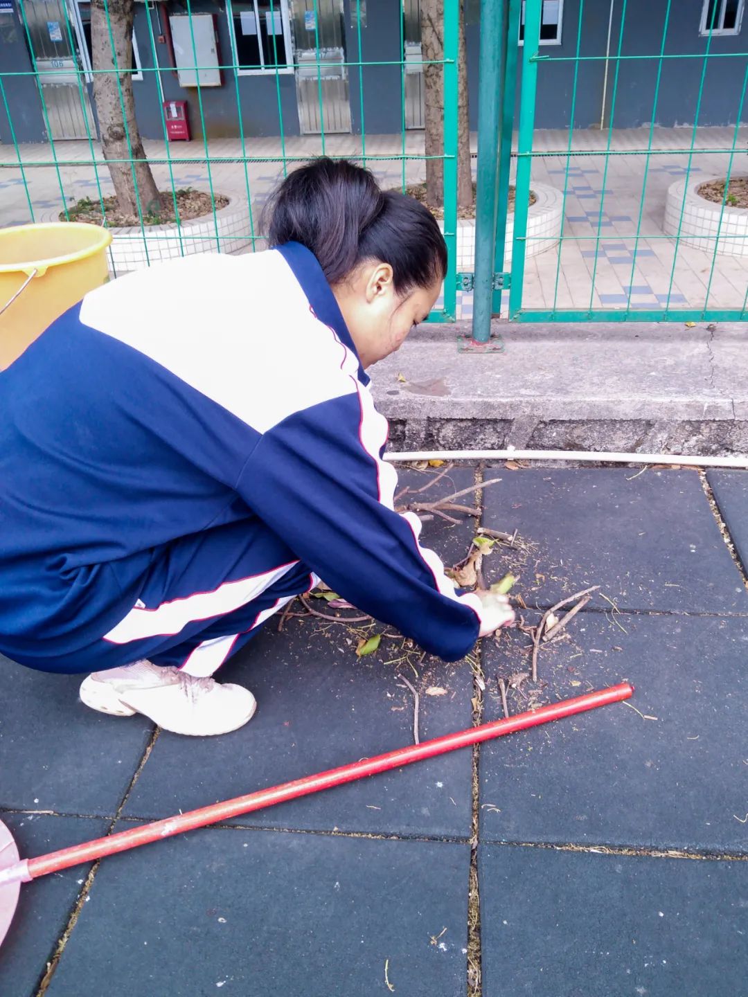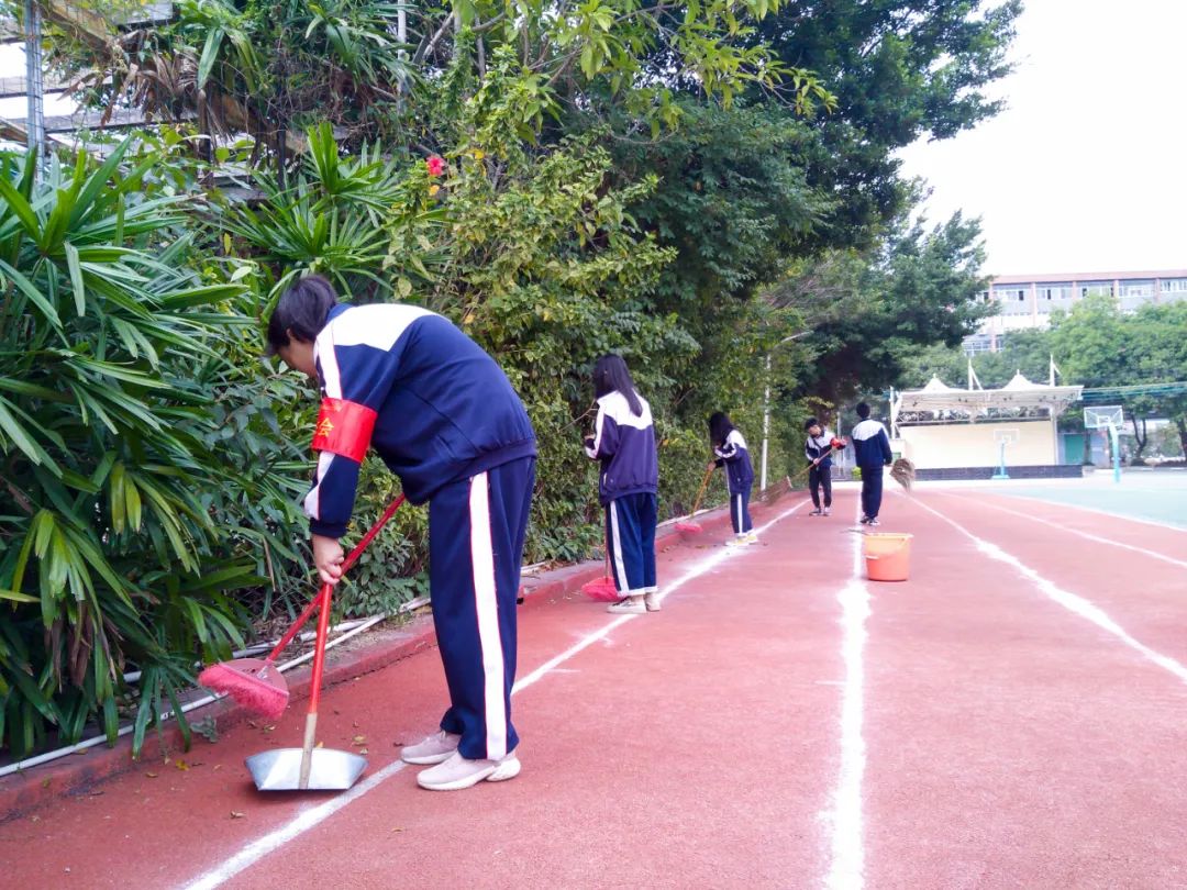 提前到達(dá)操場(chǎng)的是王廷榮、黃詩(shī)文、李仁懷、李燦彬、溫善媛等同學(xué)。他們揮動(dòng)著掃把便開(kāi)始“沙沙”地清掃落葉,掃地的聲音好像鳥(niǎo)兒在對(duì)他們唱歌,又像是在鼓勵(lì)他們:“勞動(dòng)的孩子最美麗”。