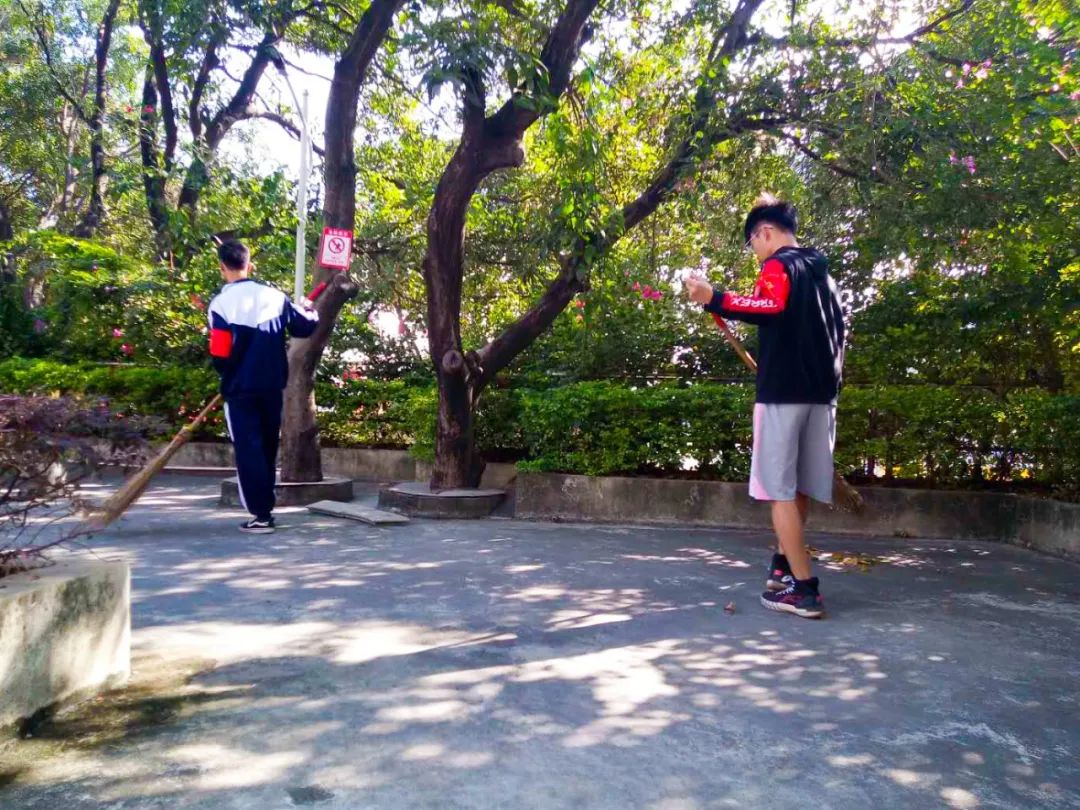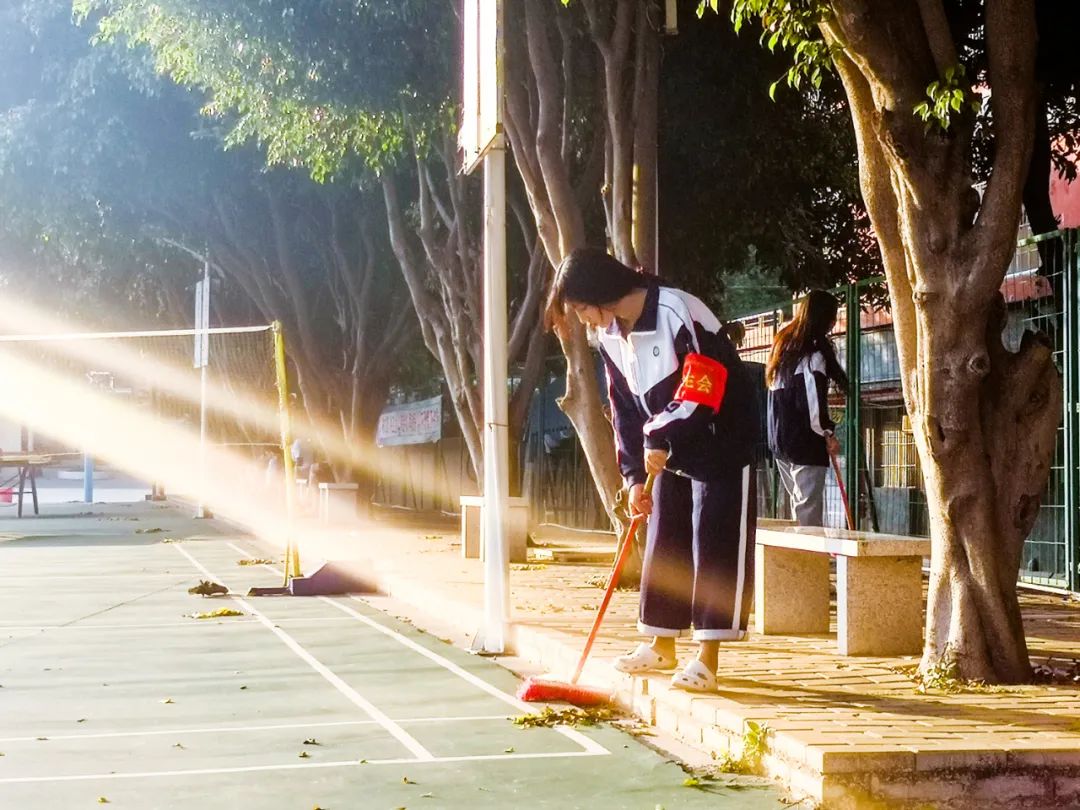 清晨,志愿者在陽(yáng)光下打掃校園